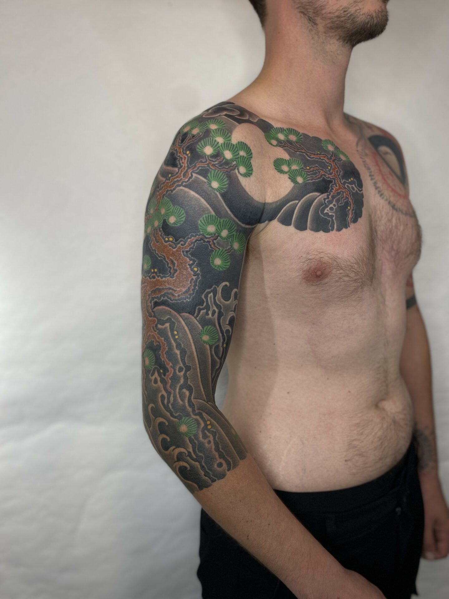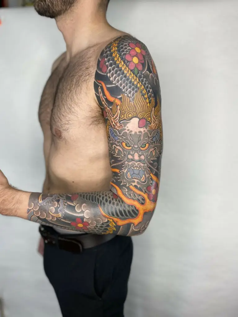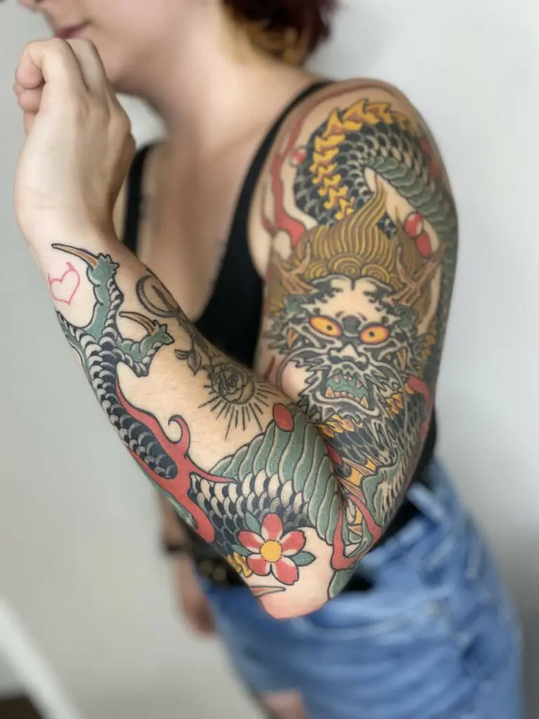 Son travail se distingue par des compositions audacieuses, souvent colorées, mêlant des éléments classiques du tatouage à des touches contemporaines.